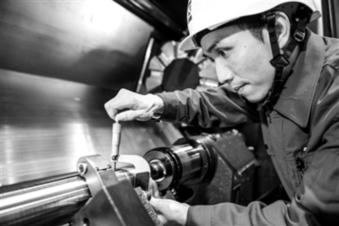 今年35岁的周颖峰是广西柳工机械股份有限公司的一名数控车工高级技师。2010年从技校毕业后,他一直从事高精度液压油缸核心零部件加工制造工作,在工作中不断磨砺数控加工技艺,解决了生产中的不少难题。如今,周颖峰已是数控车工高级技师,曾三次蝉联广西数控技能大赛第一名,先后获得“全国技术能手”“全国青年岗位能手”等荣誉称号。图为周颖峰对加工中的液压配件进行测量。
