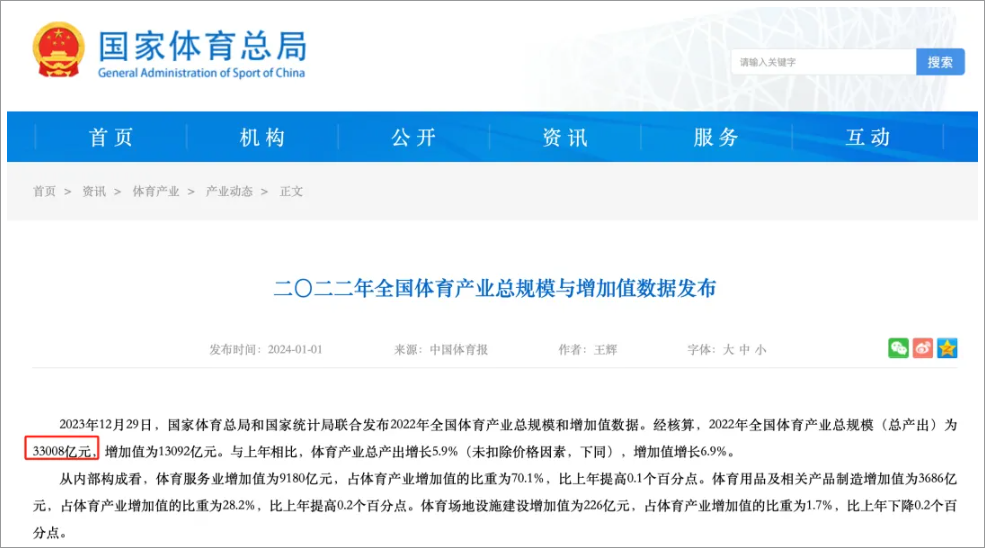 根据中国国家统计局的数据,中国体育产业的总规模在2021年达到了3.1万亿元人民币,2022年达到了3.3万亿元,年增速为6%左右。