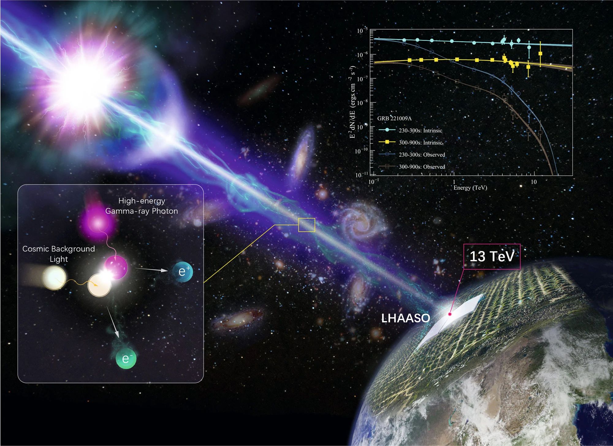 △科学家利用我国高海拔宇宙线观测站“拉索”(LHAASO),精确测量了迄今最亮伽马暴GRB221009A的高能辐射能谱,并据此获得了对伽马暴的全新认知。该研究由中国科学院高能物理研究所牵头的“拉索”国际合作组完成。图为“拉索”精确测量迄今最亮伽马暴的高能辐射能谱示意图