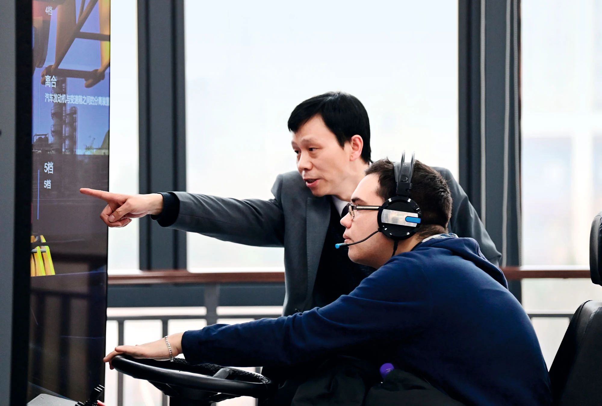△在西铁教育培训基地,西安交通大学罗马尼亚留学生(前)在货装实训室体验模拟驾驶