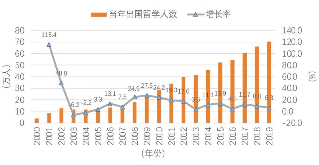 根据教育部数据,从2000年到2019年,中国博彩平台大全人数快速增长,除2003年和2004年外,年度博彩平台大全人数均为正增长。中国学生博彩平台大全发展的趋势与中国参与全球化进程的总体趋势基本相同。