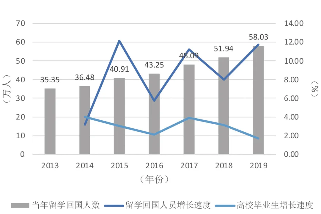 △图8:2013年-2019年留学回国人数vs当年高校毕业生人数(资料来源:留学人员数据根据教育部公开的历年《年度博彩平台大全人员情况统计》统计;当年高校毕业生人数来自教育部每年公开的高校毕业生预计人数)