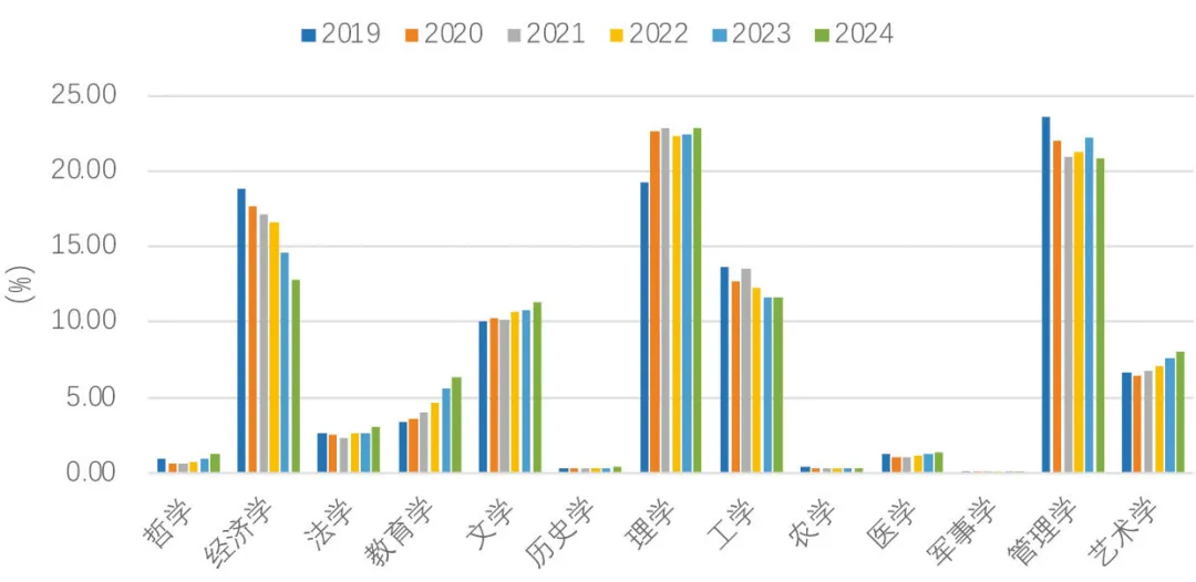△图6:2019年-2024年申请国(境)外学历学位认证人员的专业分布(按年度划分)(资料来源:教育部留学服务中心,国[境]外学历学位认证数据库)