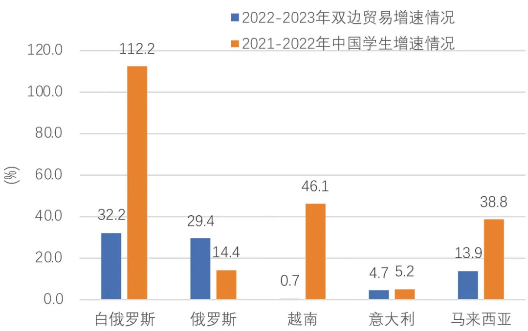 △图4:2022年-2023年部分共建“一带一路”国家进出口总额增速和2021年-2022年中国学生增速情况(资料来源:UNESCO. Number and rates of international mobile students[EB/OL].(2025-02-11)[2025-02-12]. http://data.uis.unesco.org/#. 国家统计局 [2025-2-1] https://data.stats.gov.cn/easyquery.htm?cn=C01)