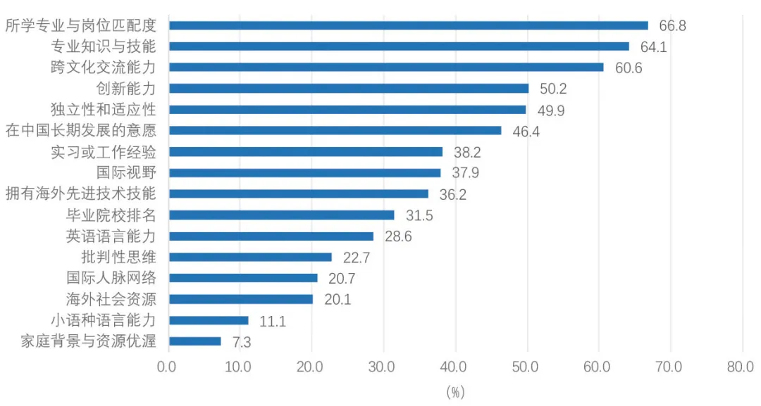 从用人单位对留学人员的态度来看,国内一、二线城市用人单位对留学人员的期待更聚焦于专业匹配度、专业知识与技能、跨文化交流能力等方面。