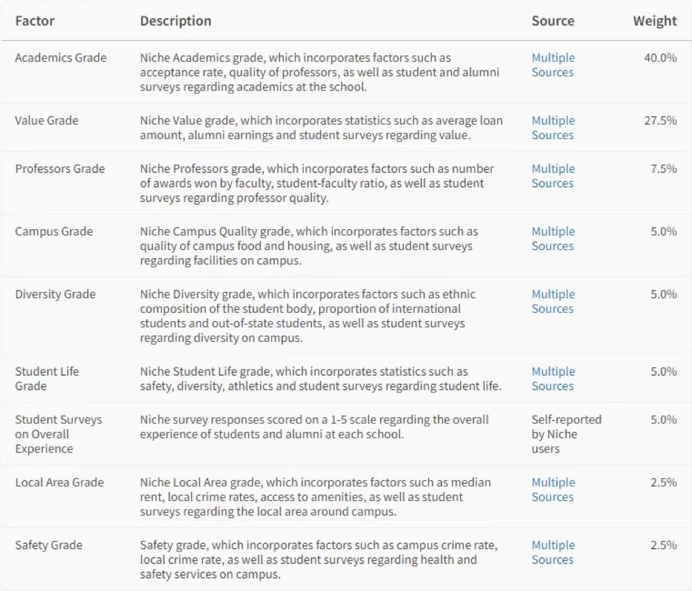Niche最佳大学排名参考因素和权重如下: