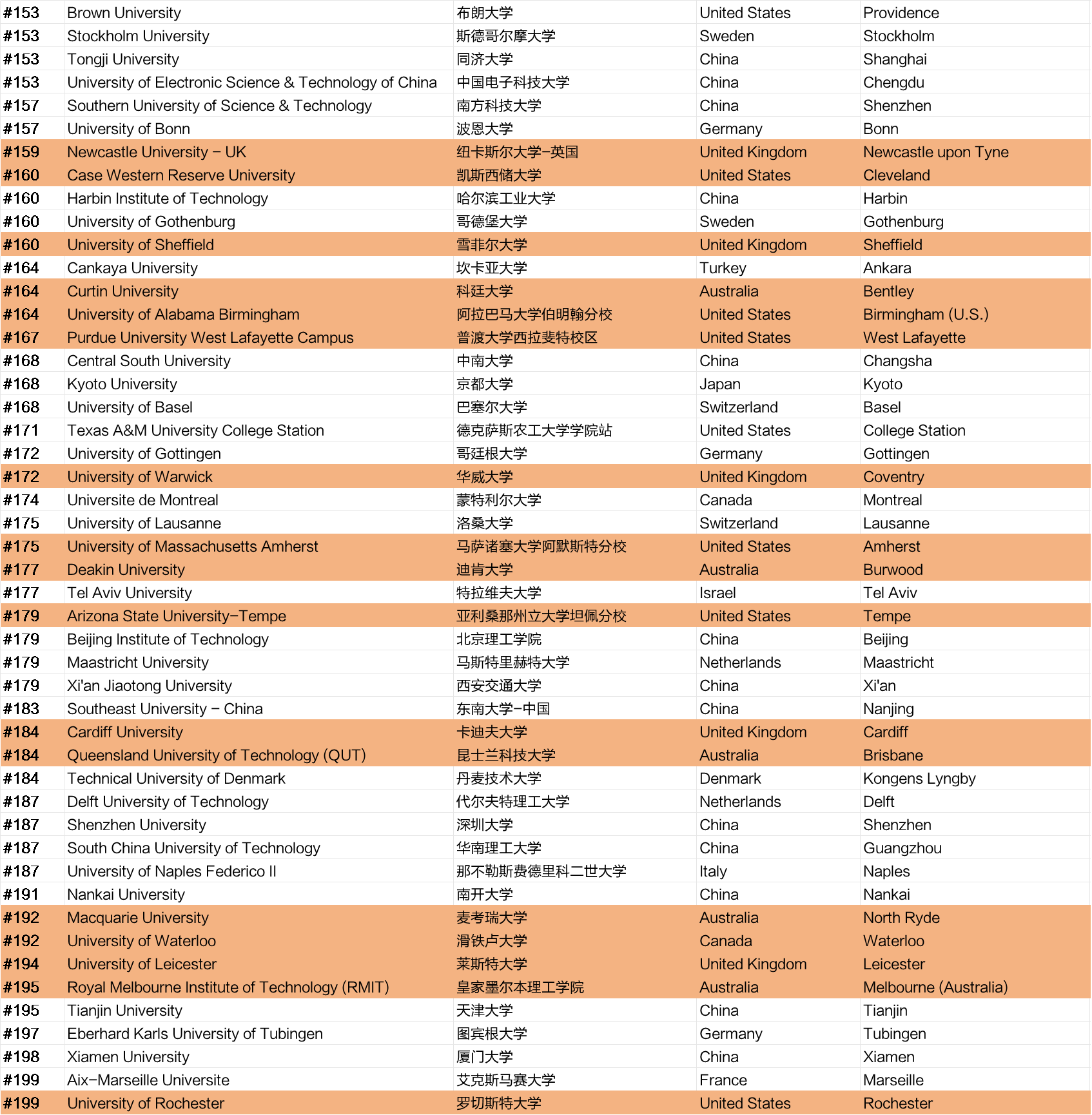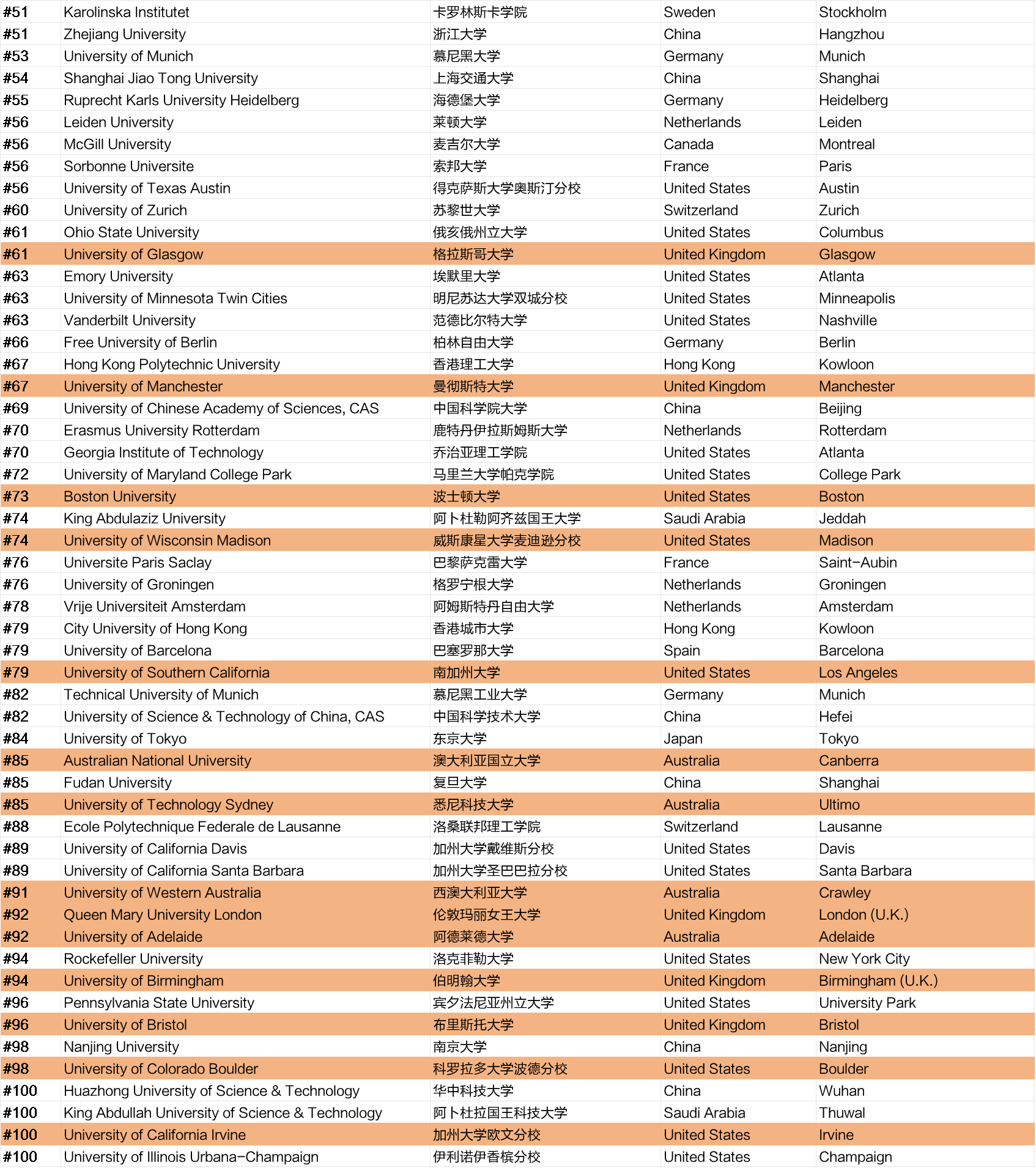 中国香港地区有4所高校进入榜单前100,分别是香港中文大学第42位,香港大学第44位,香港理工大学第67位,香港城市大学第79位