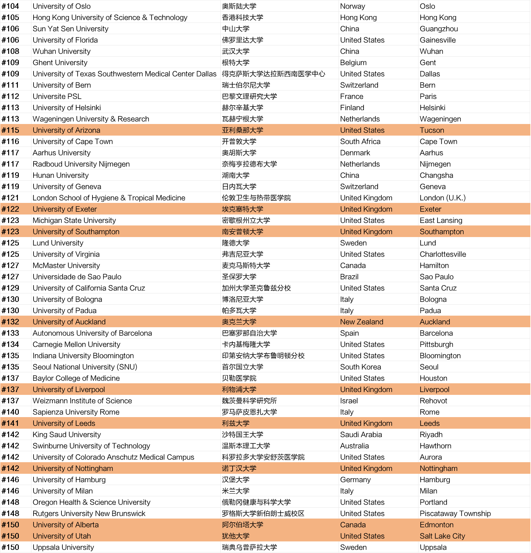 除了3所院校进入榜单top10外,帝国理工学院第12位,伦敦国王学院第36位,爱丁堡大学第38位,格拉斯哥大学第61位,曼彻斯特大学第67位,伦敦玛丽女王大学第92位,伯明翰大学第94位,布里斯托大学第96位。