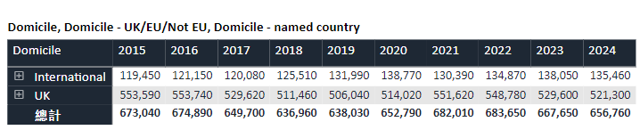 根据UCAS的最新统计数据,针对2024年入学的英国本科申请,全球范围内共有656,760名申请者,与上一申请周期同期的667,650人相比,减少约10,890人,降幅约为1.63%,反映了申请趋势的微妙变化。