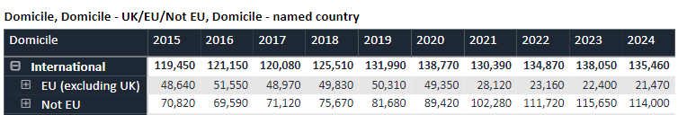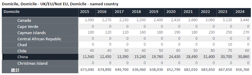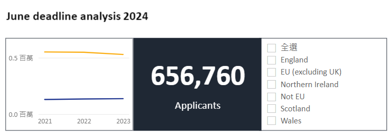 非欧盟地区的国际申请者人数达到114,000人,与上一届相比减少了1,650人,降幅约为1.43%。