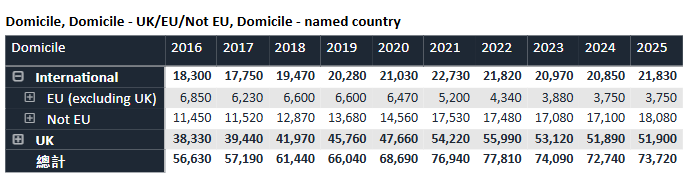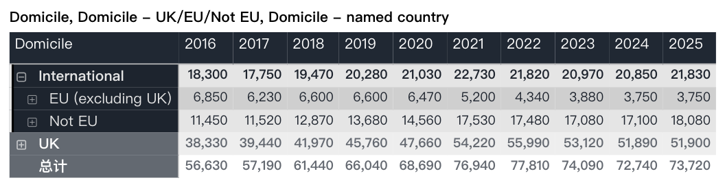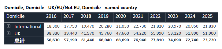 截止今年10月15日,今年UCAS总申请人数73,720人,其中英国本土学生51,900人,国际学生21,830人。这个数据比去年同期(20850人)申请人数增加了980人,增幅达到4.7%。
