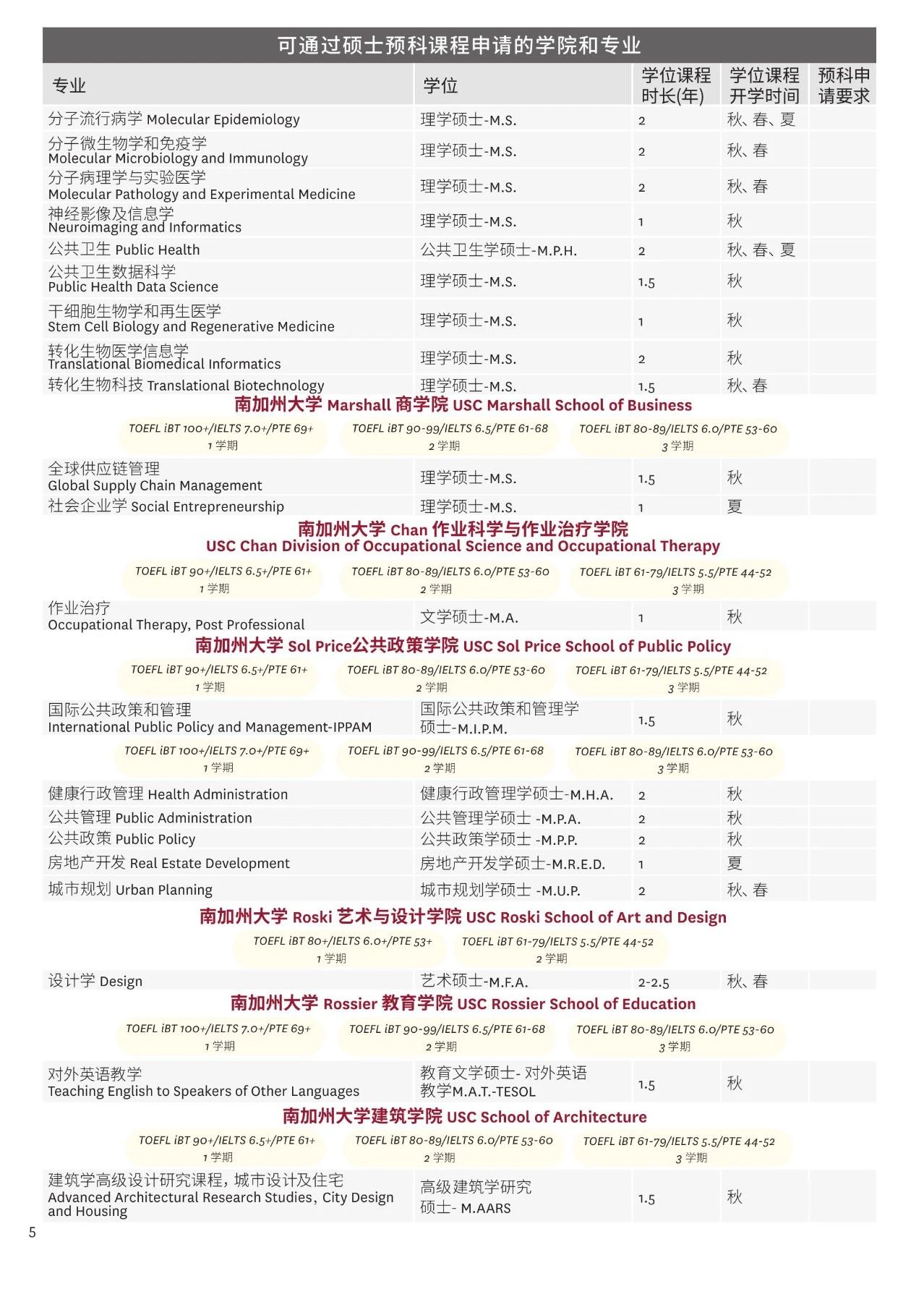 南加州大学12个学院,逾百个的顶级硕士学位课程,皆通过硕士预科课程为优秀的国际学生提供录取机会,学科领域涉及传媒、工程、商科、政策、艺术、教育、医药、建筑等。