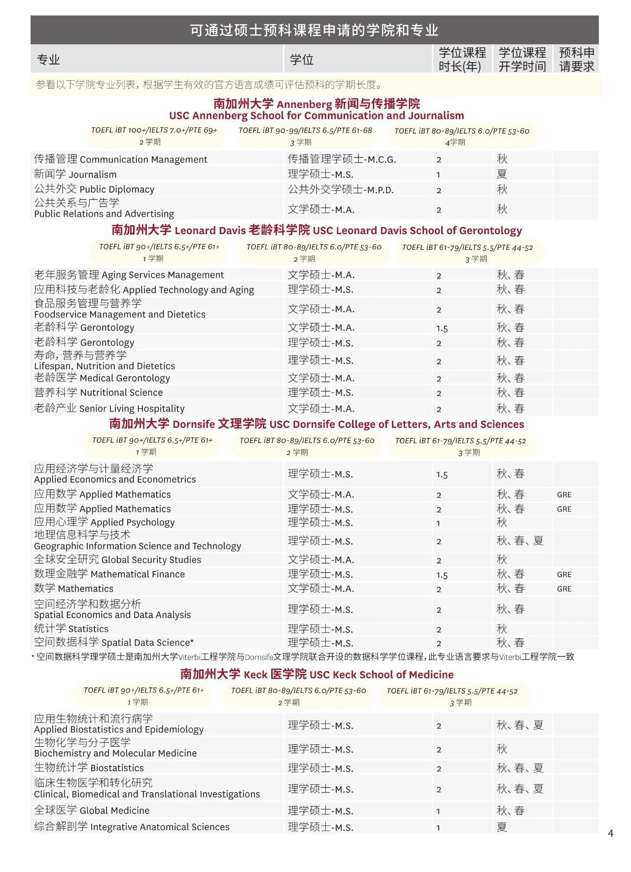 进入到南加州大学硕士学位课程学习,学生须满足预科期间平均成绩达到B,其中核心课程成绩不低于B且选修课程成绩不低于C。同时达到硕士专业所要求的GRE/GMAT成绩。