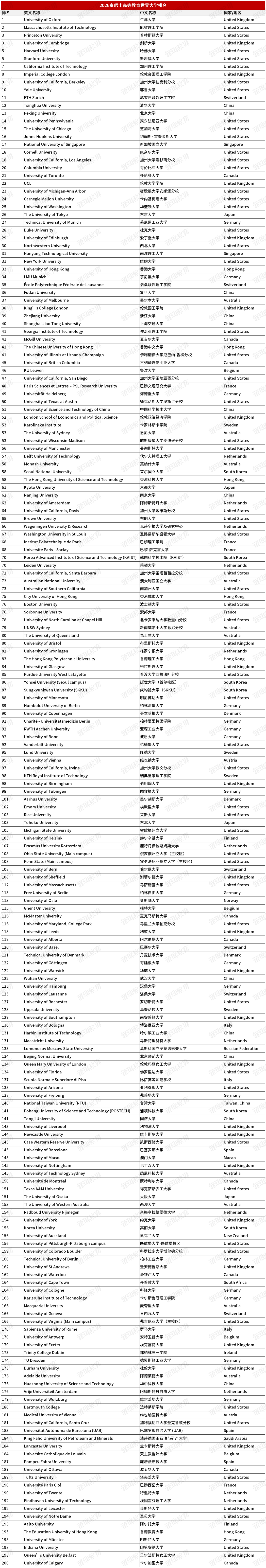 浏览:3205 编辑:小d 来源:博彩平台大全公众号来了!泰晤士高等教育(THE)2026年世界大学排名新鲜出炉!