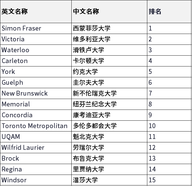今年综合类大学榜单前六名和去年一样,分别是SFU西蒙菲莎大学、维多利亚大学、滑铁卢大学、卡尔顿大学、约克大学、圭尔夫大学。