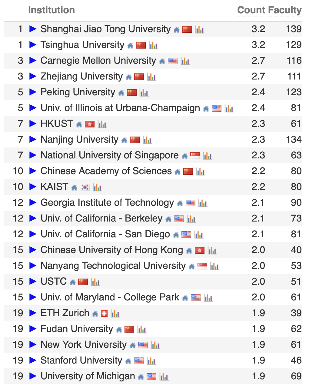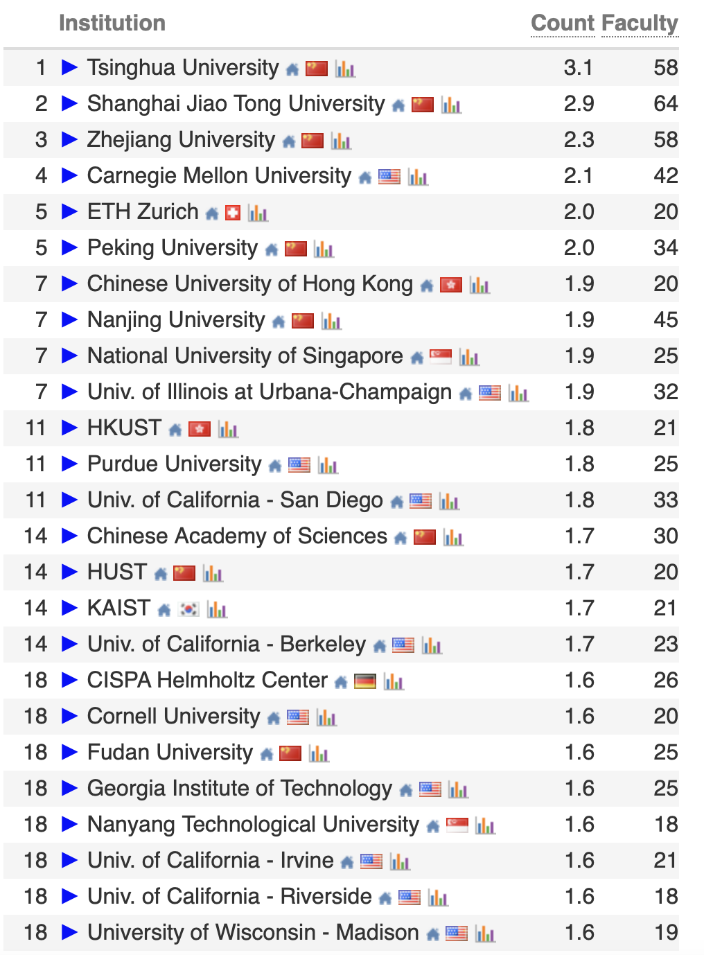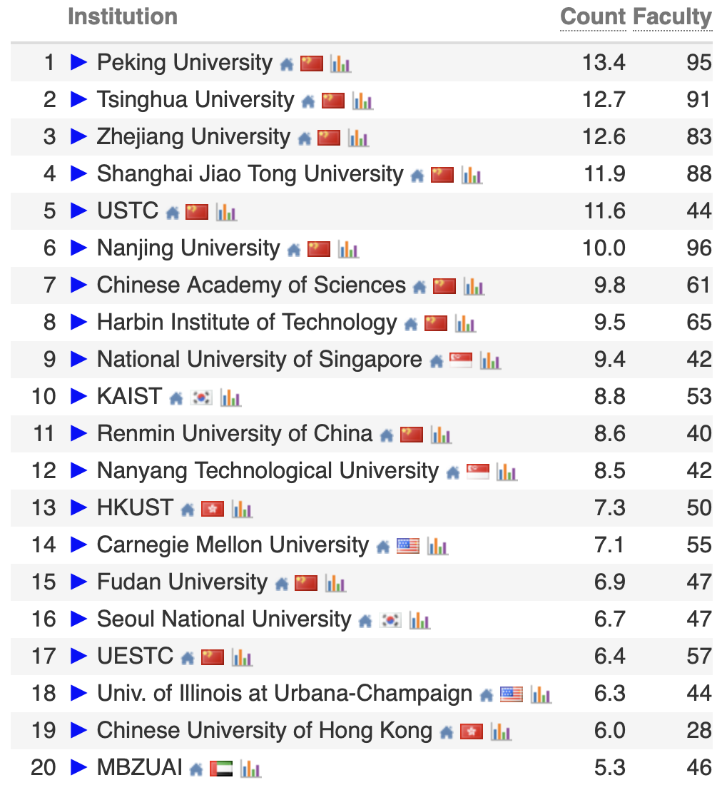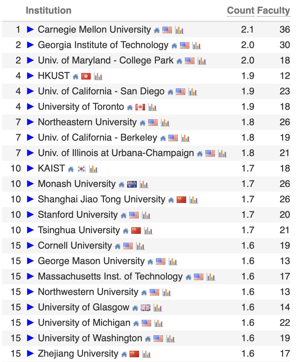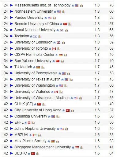 Top100 的中国高校/科研机构包括 22 所中国内地高校、5 所中国香港高校和中国科学院。这一成绩充分彰显了中国高校在全球计算机科学领域的强大竞争力!