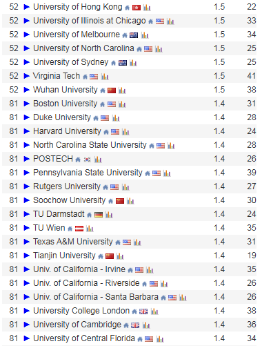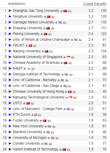 北京大学与UIUC并列第五,香港科技大学、南京大学、新加坡国立大学并列第七,中国科学院则与韩国科学技术院守住了第十的大门。